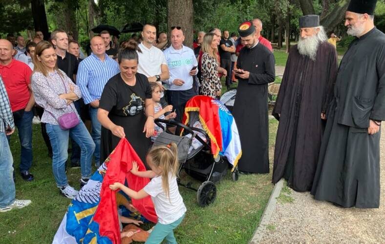 Окупљени носе заставе Србије и краљевине Црне Горе, и заставе Русије.
