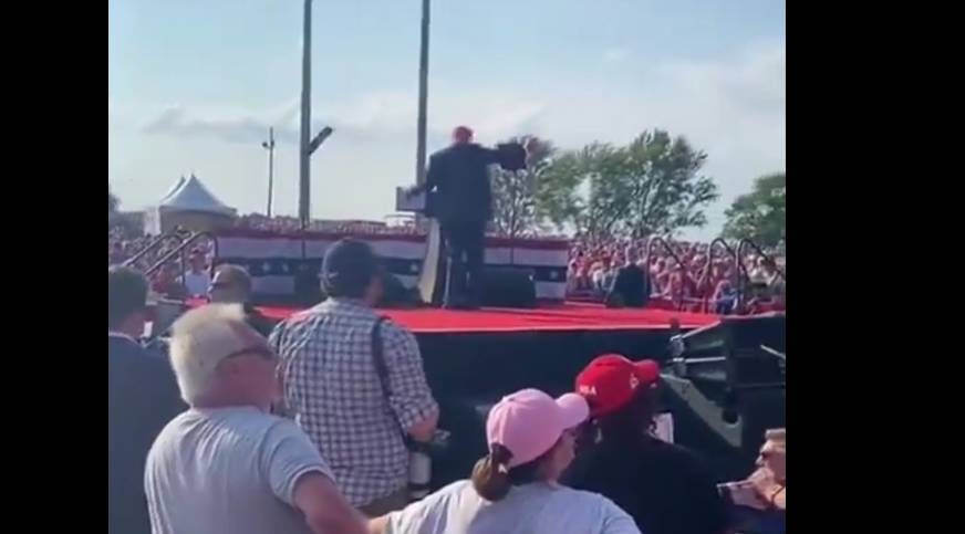 Наиме, како се на снимку може видети, док је председнички кандидат говорио зачуо се пуцањ, он се потом осврнуо око себе, ухватио за уво, видео крв, а затим клекнуо и сакрио се иза бине како би се заштитио.