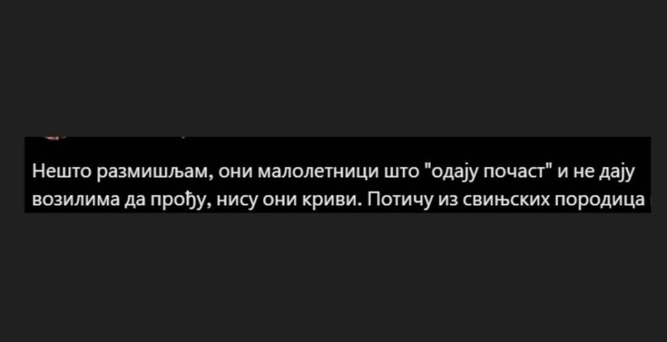 Нешто размишљам, они малолетници што "одају почаст" и не дају возилима да прођу, нису они криви. Потичу из свињских породица где је отац алкохоличар и коцкар, а мајка слободних схватања, нерадник, а узима све што јој живот пружа☹️☹️☹️