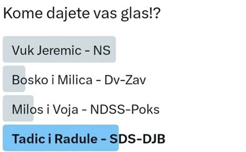 Твитер анкета: За 24 сата гласало је 1964 гласача и победник анкете је нови блок Радуловић-Тадић са 805 гласа. Одмах иза њих иде Јеремић са 785 гласова, док су Нада и Државотворни блок добили 216 и 157 гласова.