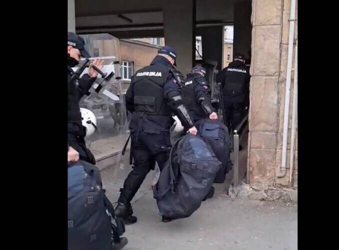 Према видео снимцима које је на друштвеној мрежи X објавио новинар Жарко Богосављевић, полицајци су на улазу у градски парламент понели пуну опрему.